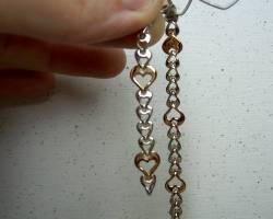 Leírás: Ennél a láncnál egy édesanya keresett meg határozott elképzeléssel, hogy milyen ékszert szeretne a lányának a ballagására. A boltokban nem lelt rá a szempontjainak megfelelőre, így az útja hozzám vezetett. Fehér és vörösaranyból szeretett volna egy olyan karkötőt szív motívumokkal, amelyre egy évszám vésése is ráfér anélkül, hogy egy oda nem illő, a láncszemek közé forrasztott lapkára kerülne az. Így született meg a képen látható lánctípus, amely áttört kisebb és nagyobb szívekből áll. Az egyik nagyobb láncszemen nincs szív alakú áttörés, ez lett végül a vésett évszám helye.