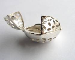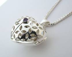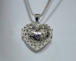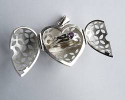 Leírás: Egy nyitható medál készítése sosem egyszerű feladat, ráadásul itt gyűrűtartóként is funkcionálnia kellett az ékszernek, mert a szeretett hölgy munkájából kifolyólag nem viselhet a kezén gyűrűt ,de szerették volna, ha ez idő alatt is magánál tudhatná az ékszert. Az elkészült medál középen kétfelé nyílik szét, valamint a középen díszeként, a gyűrű szív alakú ametiszt kövére csukódik rá.
