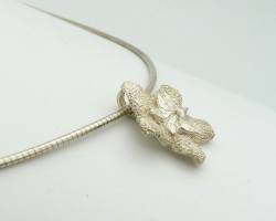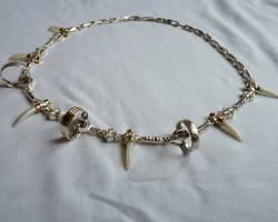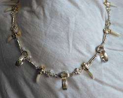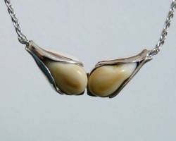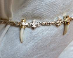 Leírás: Egy vadász keresett meg azzal a kéréssel, hogy gyöngyfogaiból mandzsettát készítsek úgy, hogy valamilyen formában a sólyom is megjelenjen. Végül a gyöngyfogak a sólymok szerves részeiként jelentek meg az ékszeren.