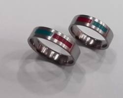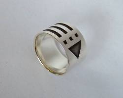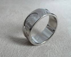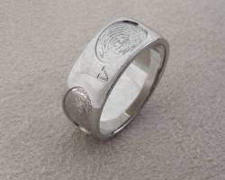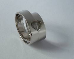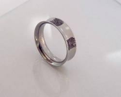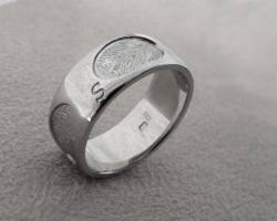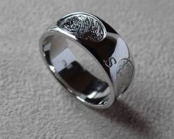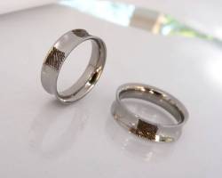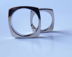 Ezeket a gyűrűket egy fiatal építész párnak készítettem rozsdamentes acélból. A gyűrűk belül domborúak, kívül homorúak tükörfényes felülettel. Nincs két ember, akik ugyanúgy fognának meg egy gyűrűt, amikor azt a kedvesük ujjára húzzák az oltár előtt. A lány -a rá jellemző egyediséggel- négy ujjal nyúlt a gyűrűhöz, míg a kedvese hárommal. A gyűrűkre mintázatképpen ujjlenyomatuk meghatározott részlete a rájuk jellemző távolságra kerültek fel lézergravírozással.