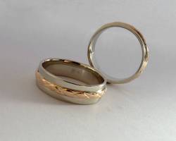 Egy építész igen határozott elképzeléssel jött hozzám arról, hogy milyen karikagyűrűt szeretne magának és a kedvesének. Az ékszerek díszének két vonalat szeretett volna, amelyek őket szimbolizálják és keresztezik egymást. Több vastagságú vonalgravír megtekintése után a képen látható vonalpárosra esett a választásuk. A vékonyabb a lányt, a vastagabb a fiút szimbolizálja. A gyűrűk végül durvább, gyémántmart felületet kaptak, hogy a két fényes vonal nagyobb hangsúlyt kapjon.